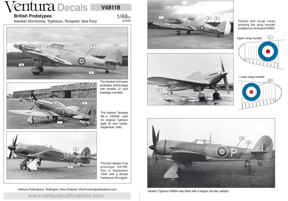 Ventura - 1/48 Prototypes. Hawker Hurricane, Typhoon, Tornado, Tempest, Sea Fury. Roundels included for Hurricane.