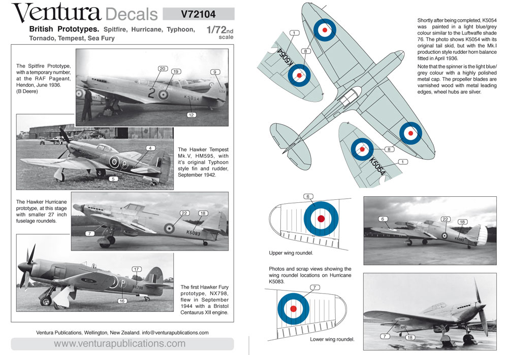 Ventura - 1/72 British Prototypes. Supermarine Spitfire, Hawker Hurricane, Typhoon, Tornado, Tempest, Sea Fury. Roundels included for Spitfire and Hurricane.