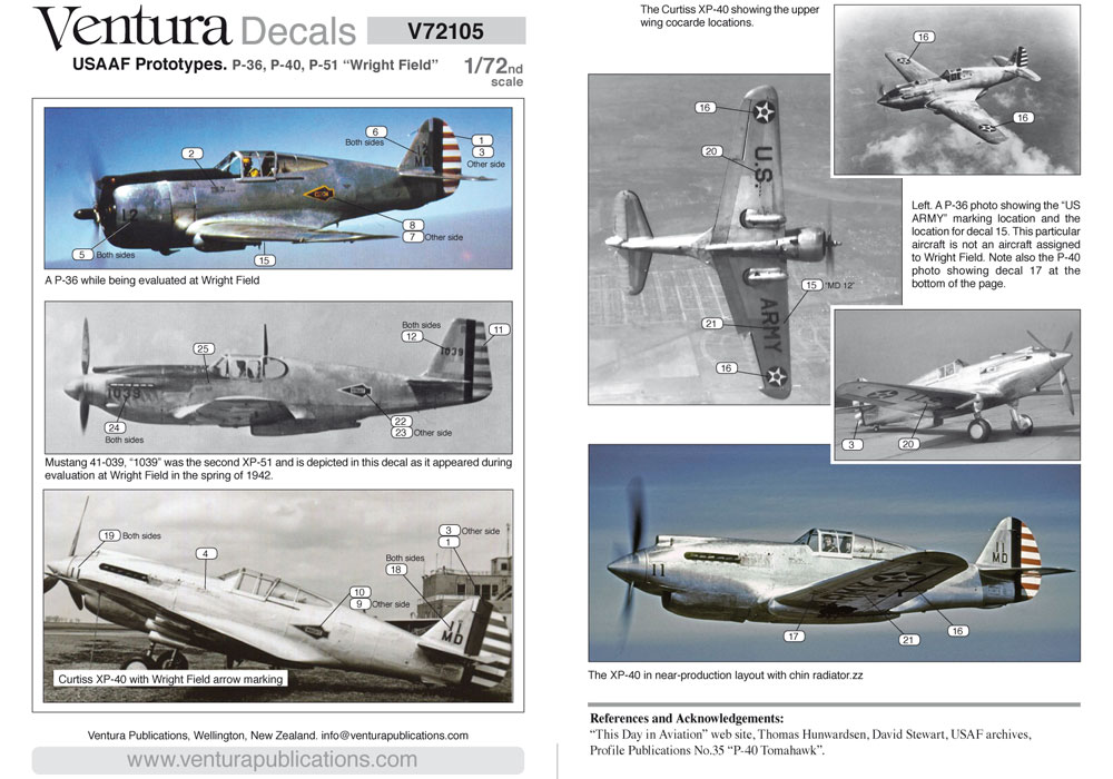 Ventura - 1/72 Prototypes. Curtiss P-36, P-40, North-American P-51. Wright Field 'arrow' markings
