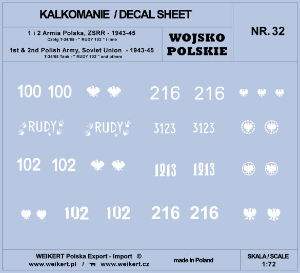 WEIKERT DECALS - 1/72 1st & 2nd Polish Army T-34/85 RUDY 102 & others decal