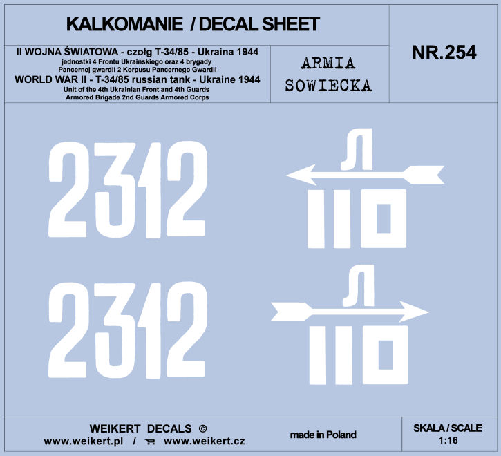 WEIKERT DECALS - 1/16 Russian tank T-34/85 4th Ukraincludes Fr., UA 1944 decal