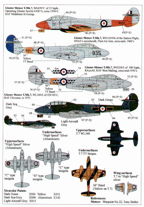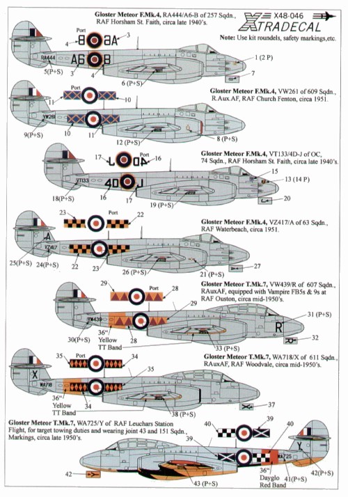 Xtradecal - 1/48 Gloster Meteor F.4 and Gloster Meteor T.7 (11) F Mk.4 (4) RA444 A6-B 257 Sqn, VT133 4D-J 74 Sqn both Horsham St Faiths late 1940s, VW261 609 Sqn R Aux Air Force Church Fenton 1951, VZ417/A 63 Sqn RAF Waterbeach, T Mk.7 (7) VW439/R 607 Sqn Royal Aux.AF RAF Ouston mid 1950s, WA718X 611 Sqn Royal Aux.AF RAF Woodvale mid 1950s, WH224/Z 500 Sqn Royal Aux.AF West Malling mid 1950s, WS116/935 Station Flight RNAS Lossiemouth. All overall high speed silver. WA725/Y RAF Leuchars Station Flt Joint 43/151 Sqns markings, WA659/Y 33 Sqn RAF Middleton St George 1958 both with yellow/black Target Tug stripes. WL349/Z 229 OCU RAF Chivenor 1973 green/dark sea grey/lt aircraft grey camouflage