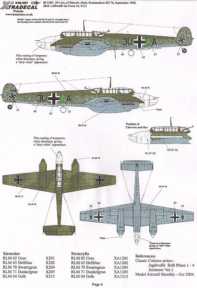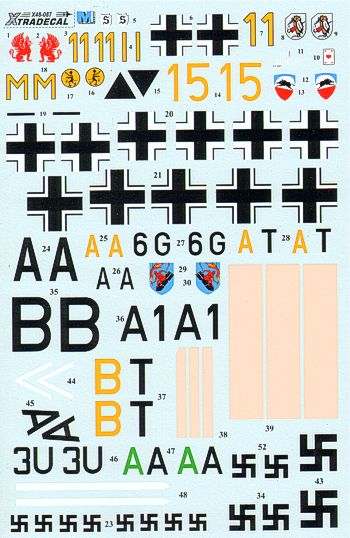 Xtradecal - 1/48 . Battle of Britain Luftwaffe (8) Messerschmitt Bf 109E-3/Bf 109E-4 Yellow 11 9./JG 26 Fw Artur Beese Aug 1940, Yellow 1 6./JG 51 Oblt Josef (Pips) Priller Staffelkapitan Oct 1940, Yellow M 6(Schlact)/LG 2 Fw Erhardt Pankratz Oct 1940, All yellow nose/rudder, Yellow 15 3./JG 52 Uffz Karl Wolff Aug 1940 White nose/rudder, Junkers Ju 87B-1 6G AT 6./St.G 1 Summer 1940, Messerschmitt Bf 110C 3U AA ZG 76 Oberslt Huth, Kommodore Sept 1940, Heinkel He 111H-2 9./KG 53 A1 BT Sept 1940, Double sheet