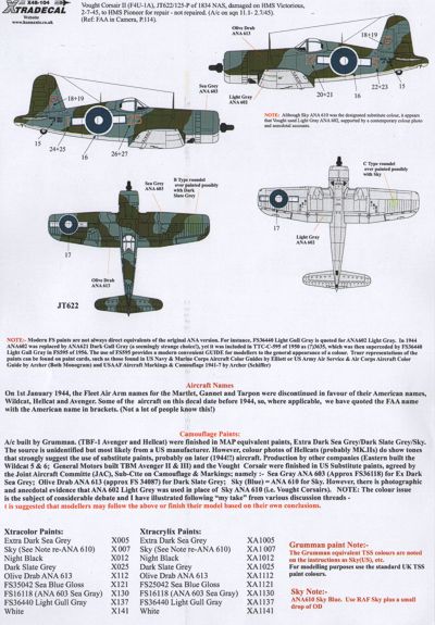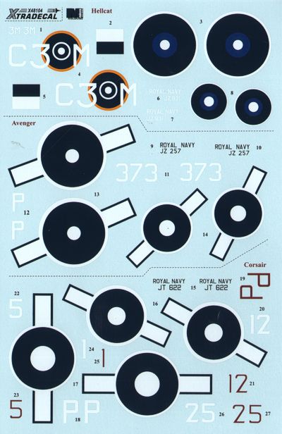 Xtradecal - 1/48 Yanks with Roundels Part 3 U.S. Aircraft in the Fleet Air Arm (3) Grumman F6F-5 Hellcat Mk.II JZ931 C3-M 800 NAS Trincomalee 1945, Grumman TBM-1C Avenger Mk.II JZ257 373/P 849 NAS HMS Victorious British Pacific Fleet 1945, Vought F4U-1A Corsair Mk.II JT622 125/P 1834 NAS HMS Victorious 1945,