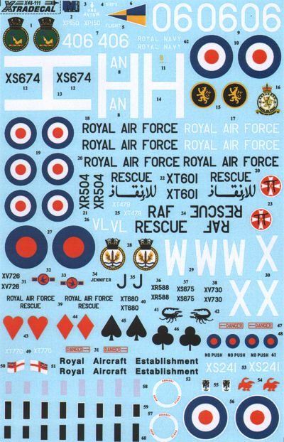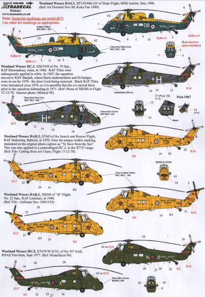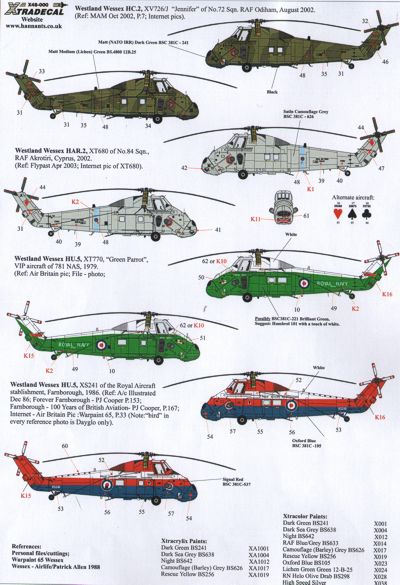 Xtradecal - 1/48 Westland Wessex - Wessex HC.2 XS674/H 78 Sqn RAF Khormaksar, Aden 1966; XV726/J 'Jennifer' 72 Sqn RAF Odiham 2002; HAR.2 XT680 84 Sqn RAF Akrotiri 2002; XT601 SAR Flight RAF Muhurraq, Bahrain 1979; XR504 B Flight 22 Sqn RAF Leuchars 1990; HU.5 XT479/W-X/VL 707 NAS RNAS Yeovilton 1977; XT770 VIP aircraft 781 NAS 1979 'Green Parrot'; XS241 RAE Farnborough 1986 Raspberry Ripple