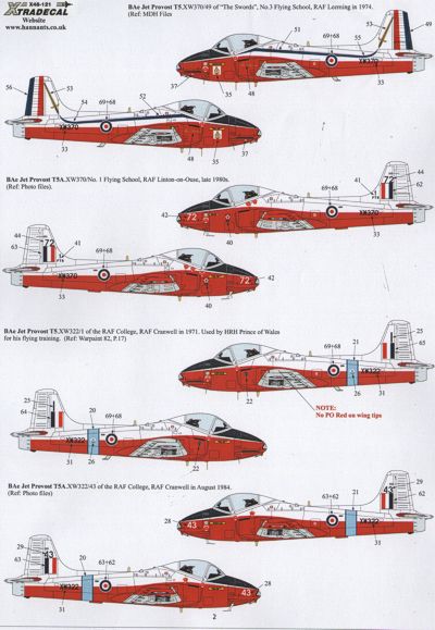 Xtradecal - 1/48 BAe Jet Provost T.5 Pt 1 (11) XW290 in three slightly different schemes with the Red Pelicans Display Team at the CFS Little Rissington from 1970, 1972, 1973 and 3 FTS RAF College Cranwell 1988; XW370/49 The Swords Display Team 3 FTS RAF Leeming 1974; XW370/72 1 FTS RAF Linto-on-Ouse 1980s; XW322/1 RAF College Cranwell 1971 used by HRH Prince of Wales for his flying training; XW322/43 RAF Cranwell 1984; XW325/E 6 FTS RAF Finnigley 1990 RAF Support Command Display aircraft flown by FLt.Lt.Darren Legg; XW370/49 3 FS 1972 or 1973 one of the Gemini Pair For FLY kit. In preparation. Jet Provost T.5/T.5A