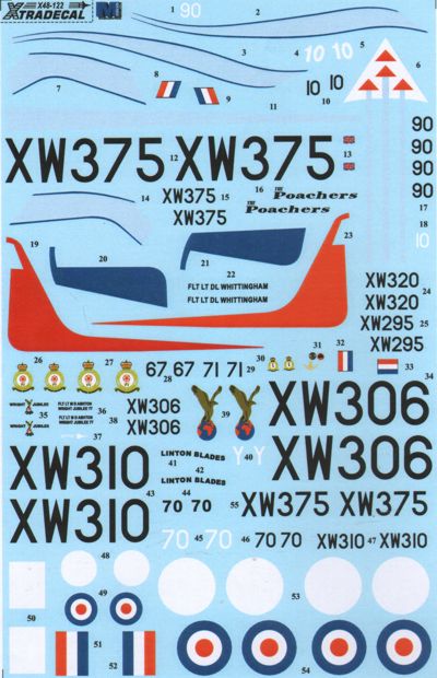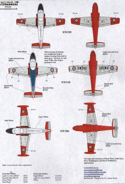 Xtradecal - 1/48 BAe Jet Provost T.5 Pt 2 (8) XW375 in four slightly different schemes with the Poachers Display Team at RAF College Cranwell from 1971 1976; XW295 N 1 FTS RAF Linton-on-Ouse 1985 flown by Flt.Lt. D.J.Whittington winner of the Wright Jubilee Trophy and as modified in Sept 1985 with the addition of Linton-on-Ouse badges. XW320 also in same schemes. XW306/Y flown by Flt.Lt M.D.Alton winner of the Wright Jubilee Trophy 1977 6 FTS RAF Finningley; XW310/70 1 FTS The Blades Display Team Linton-on-Ouse 1973 Jet Provost T.5/T.5A