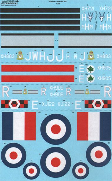 Xtradecal - 1/48 Scale Gloster Javelin Faw Mk.9 Part 1 (5) XH721 Mhm flown by Wing Co Michael Miller 60 Sqn Raf Tengah 1961; XH883 25 Sqn Raf Waterbeach 1960; XH905/E 5 Sqn Raf Geilenkirchen 1960s; XH909/R 25 Sqn Raf Waterbeach 1958; XJ122/E 85 Sqn Raf West Raynham