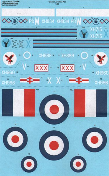Xtradecal - 1/48 Scale Gloster Javelin Faw Mk.9 Part 2 (5) XH834/PDW 64 Sqn Raf Tengah 1965; XH715/X 33 Sqd Raf Middleton St George 1962; XH889/O Wing Co A.J.Owen 23 Sqn Raf Horsham St Faith 1962; XH966/X 41 Sqn Raf Wattisham 1963; XH960/V 29 Sqn Raf Akrotiri 1965.