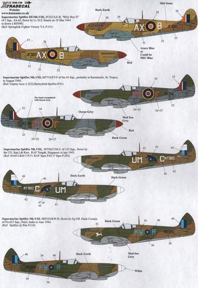 Xtradecal - 1/48 Supermarine Spitfire Mk.VIII (8) JF404 GZ-M 32 Sqn Italy 1944; JF476 QL-D 92 Sqn Sicily 1943; JF447 UF-7 601 'County of London' Sqn Italy 1943; T928 Z-M 145 Sqn Italy 1945; 322 AX-B ;Billy Bou II' 1 Sqn SAAF 1944; MT714 FT-F 43 Sqn St Tropez 1944; MT982 UM-C 152 Sqn CO Sqn.Ldr Kerr Singapore 1945; MD324 KW-R 615 Sqn India 1944