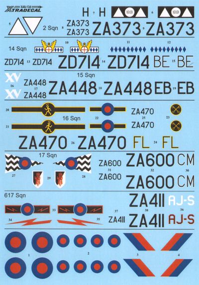Xtradecal - 1/48Panavia Tornado GR.1/GR.1A Pt.1 (6) ZA373/H 2 Sqn RAF Marham 1990, ZD714/BE 14 Sqn RAFG Bruggen 1985, ZA448/EB 15 Sqn RAFG Laarbruch 1984, ZA470/FL 16 Sqn RAFG Laarbruch 1984, ZA600/CM 17 Sqn RAFG Bruggen 1985, ZA411 AJ-S 617 Sqn RAF Marham 1989. All overall green/dk sea grey camo.