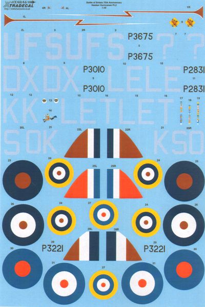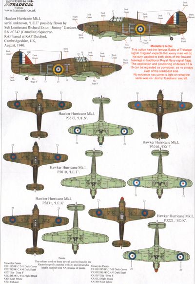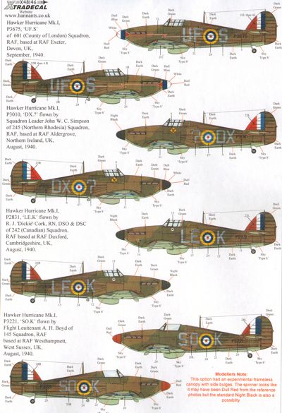 Xtradecal - 1/48 Hawker Hurricane Mk.I 1940 Battle of Britain Pt.2 (5) P3221 SO-K 145 Sqn Flt.Lt A.H.Boyd RAF Westhampnett, W.Sussex P2831 LE-K 242 (Canadian) Sqn R.J. 'Dickie' Cork RN, DSO. DSC RAF Duxford Unknown LE-T 242 (Canadian) Sqn Sub Lt Jimmy Gardner RN RAF Duxford P3010 DX-? 245(Northern Rhodesia) Sqn Sqd/Ldr RAF Aldergrove N.Ireland, P3675 UF-S 601 (County of London) Sqn RAF Exeter with Lightning bolt on nose,