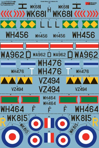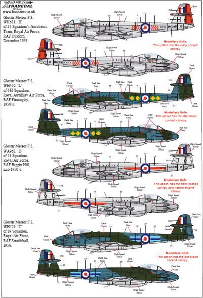 Xtradecal - 1/48 Gloster Meteor F.Mk.8 Collection Pt 2 (7) VZ494 501 Sqn R.Aux.AF RAF Filton 1957, WA962/D 41 Sqn RAF Biggin Hill 1950s, WH456/L 616 Sqn R.Aux.AF RAF Finningley 1950s, WH464/F 504 Sqn R.Aux.AF RAF Wymeswold 1953, WH476/T 89 Sqn RAF Stradishall 1956, WK681/H 65 Sqn Aerobatic Team Duxford 1953, WK815/R Target Towing Sqn RAF Sylt, Germany 1959,