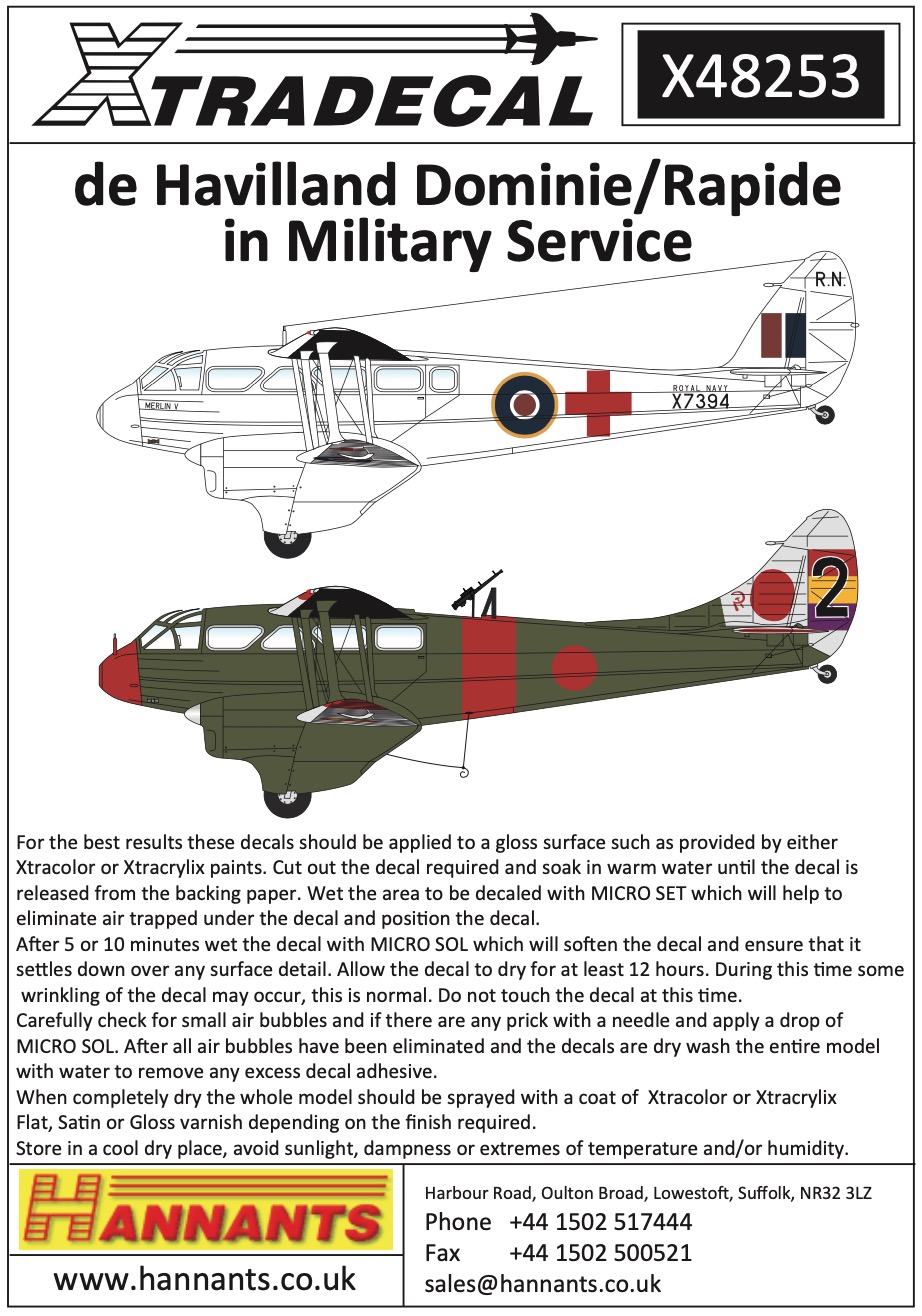 Xtradecal - 1/48 De Havilland DH.89 Dragon Rapide,/Dominie 5de Havilland Rapide Military, 6311/'2' of Escuadron 'Alas Rojas' Spanish Republican Air Force, based in Spain, August, 1936de Havilland Dominie, A33-3, of No.1 Air Observers School, Royal Australian Air Force, based at Cootamundra, New South Wales, Australia, 1943.de Havilland Dominie C.1, NZ523, of Fiji Communications Flight, Royal New Zealand Air Force, based in Fiji, 1944-45.de Havilland Dominie, X7524, of 27th Air Transport Group, Eighth Air Force, United States Army Air Corps, based at Abbots Ripton, UK, 1943de Havilland Dominie, X7394, of 782 Naval Air Squadron, Royal Navy, based at Rnas Donibristle, UK, 1946..