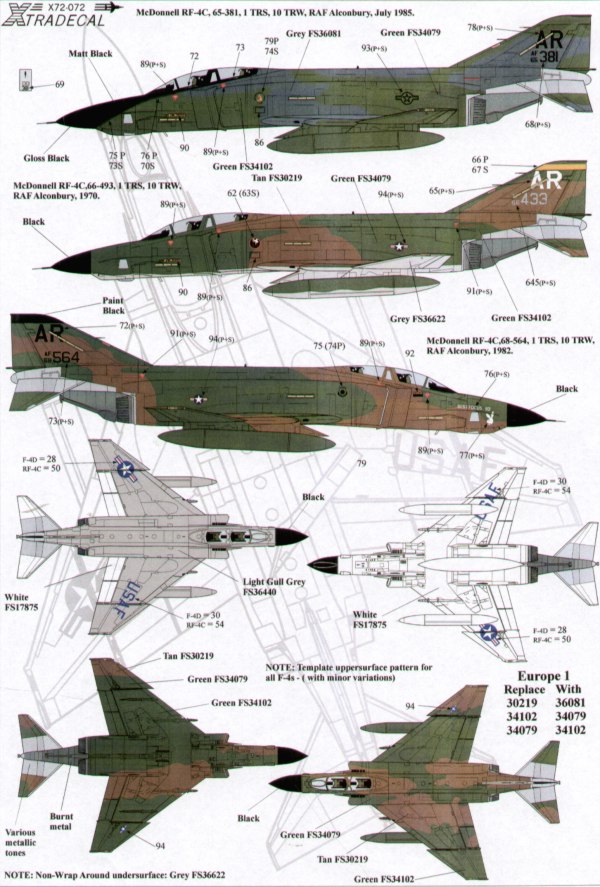 Xtradecal - 1/72 Usafe Uk based McDonnell F-4 Phantoms (16) McDonnell F-4D Phantom 81st Tfw Raf Woodbridge/Bentwaters. 64-0864/FJ-864 early grey/white scheme, 66-261/WR 1977 also with Tj codes before leaving for Torrejon, 66-553/WR 1977, 65-696/WR 1973, 64-856/WS, 64-911/WT, 48th Tfw Raf Lakenheath. 65-773/LK pre 1972 multi-coloured fin top, 66-502/LN 1975 red fin top, 65-721/LN 1976 yellow fin top and 65-659 1975 multi-coloured fin top both with FS34201 replacing FS30219, McDonnell RF-4C Phantom 1st TRS/10th Trw Raf Alconbury 64-1077 1967 early grey/white scheme, 64-007/AS pre 1971 later carried Ar with blue/yellow check fin top, 66-443/AR yellow fin top, 68-553/AR blue fin top with FS34201 replacing FS30219, 65-381/AR 1978 Euro 1 camouflage, 68-564/AR black fin top `Best Focus 1982' wrap around Sea scheme. All in Sea scheme FS30219/ FS34079/ FS34102/ FS36622 unless otherwise noted