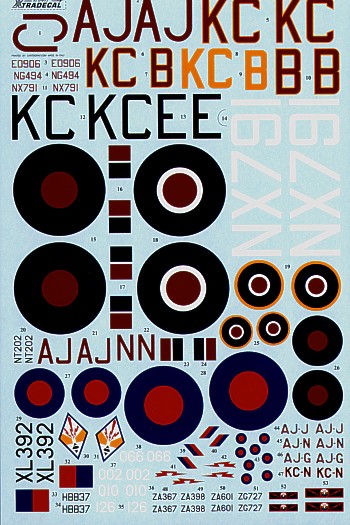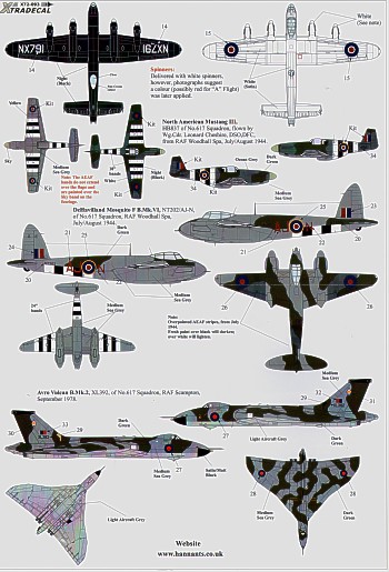 Xtradecal - 1/72 Scale Reprinted. 617 (Dambusters) Squadron 1943-2008 (10) Avro Lancaster Mk.III ED906 AJ-J Fl.Lt D.J.H Maltby DFC, the fifth Lanc to attack the Mohne Dam 16/17 May 1943 causing the breach. Avro Lancaster Mk.I NG494 KC-B April 1945 with bulged bomb bay for Tallboy bomb; Avro Lancaster Mk.VII NX791 KC-E Digri India 1946 White top/black undersurfaces; Mustang III HB837 flown by Wg.Cdr.Leonard Cheshire DSO/DFC as Pathfinder 1944; de Havilland Mosquito Mk.VI NT202 AJ-N Pathfinder 1944; Avro Vulcan Mk.2 XL392 Raf Scampton 1978; Panavia Tornado GR.4 ZA367/002/KC-4; ZA601/066/AJ-G; GR.4A ZA398/010/AJ-N; ZG727/126/AJ-J all in modified 2008 scheme Raf Lossiemouth. (keyword search info Avro Lancaster Mk.I/III) ------(V Bombers/V-Bombers/V.Bombers)
