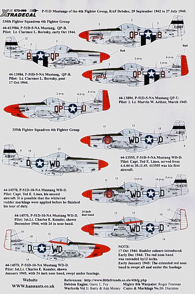 Xtradecal - 1/72 North-American P-51D Mustangs from the 4th Fg (3) 334 FS. 44-413984 QP-B Lt C.Boresky `Meg' 2 versions, 44-413984 QP-U Lt Marvin Arthur `Davey Lee', 335 FS. 44-13555 WD-D Capt Ted E.Lines `Thunderbird' or 44-14570 WD-D, 44-14570 WD-D Lt C.Konsler 2 versions, 336 FS. 44-14276 VF-A Capt F.Young `Martha Jane' 2 versions, 44-14276 VF-A Lt James McMahon `Marcy'
