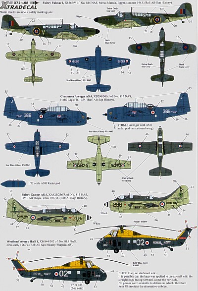 Xtradecal - 1/72 Fleet Air Arm/FAA 815 RNAS 1942-2009 (11) Fairey Swordfish L7648/X NAS Heliopolis, HS180 S6-B NAS Dekhelia, both Egypt 1942, Fairey Albacore Mk.I X8977 S5-Q NAS Dekhelia, Egypt 1942, Fairey Fulmar X8566/X NAS Mersa Matruh, Egypt 1943, Grumman Avenger AS.4 XB296 366/J HMS Eagle 1954, Fairey Gannet AS.4 XA425 296/R HMS Ark Royal 1957, Westland Wessex HAS.I XM844/302 1960s, Westland Lynx (4) Westland Wessex HAS.2 XZ230/301 HQ Flt Yeovilton 1982, Westland Wessex HAS.2 XZ233/334 HMA Southampton Falklands 1983, HAS.3 XZ232 MC/360 HMS Manchester Falklands 2009, HMA.8 XZ731 375/SM HMS Somerset Lt Jamie Haggo RN.