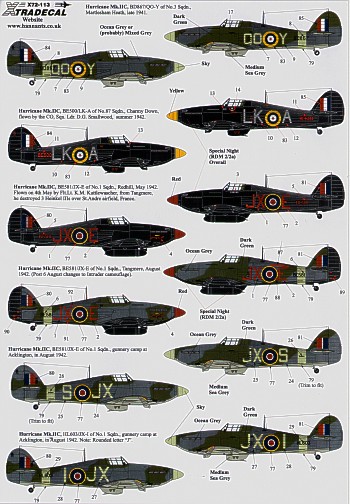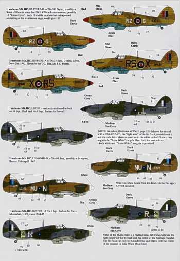 Xtradecal - 1/72 Hawker Hurricane Mk.IIc (18) BE500 LK-A 87 Sqn 1942, BE581 JX-E 1 Sqn Flt.Lt K. M. Kuttlewascher , BD936 ZY-S 247 Sqn Exeter 1942. Overall black, BE581 JX-E 1 Sqn. HL864 LK- 87 Sqn 1942, HL865 LK-R 87 Sqn Green/Ocean Grey top, black undersurfaces, BD867 QO-Y 3 Sqn Martlesham Heath 1941, BN964 JX-S 1 Sqn 1942, HL603 JX-I 1 Sqn 1942. All Day Fighter camouflage BE543 AK-U 213 Sqn P/O Bert Houle Western Desert 1942, HL887 AK-W 213 Sqn 1942, HV817 FT-C 43 Sqn Algeria 1942, HL851 GO-P 94 Sqn `The MacRobert Fighter-Sir Iain' Egypt 1942, HL973 RZ-G 241 Sqn 1943, BP588 RS-X 33 Sqn S/Ldr S.C.Norris Co 1942. All North Africa camouflage Dk Earth/Mid Stone/Azure Blue. LB935/L 34Sqn or 4 Sqn Indian AF, KZ371/R 1 Sqn Indian AF. Both Day Fighter camouflage with Seac roundels. LD349 MU-N 60 Sqn Burma 1945 Dk Green/Dk Earth/Med Sea Grey.