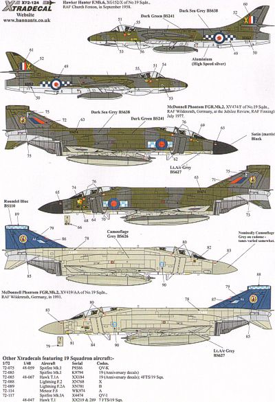 Xtradecal - 1/72 History of Raf 19 Sqn 1935 91 (8) Gloster Gauntlet Mk.I K4095 Duxford 1935, North-American P-51B Mustang III FZ164 QV-V 'Wilf' Flt.Lt. T.H.Drinkwater Raf Gravesend 1944, Supermarine Spitfire Mk.XVIe TE470 QV-B Raf Biggin Hill 1946, de Havilland Hornet F.1 PX284/H Raf Linton-0n-Ouse 1946, Gloster Meteor F.8 WE863 Coronation Review Raf Odiham 1953, Hawker Hunter F.6 XG152/X Raf Church Fenton 1958, McDonnell-Douglas FGR.2 Phantom XV474/F Raf Wildenrath at Jubilee Review Raf Finningley 1977 green/grey camouflage, McDonnell-Douglas FGR.2 Phantom XV419/AA Raf Wildenrath 1991 Camouflaged Grey with Blue fin.
