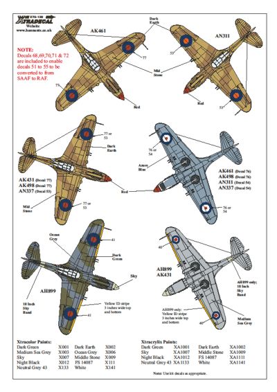 Xtradecal - 1/72 Scale Reprinted. Curtiss P-40B Tomahawk (13) AH179 RM-E 26 Sqn Gatwick 1941; AK185 RU-V 414(RCAF) Sqn Croydon 1941; AH882 KH-A 403(RCAF) Sqn Gatwick 1941; AH784 NM-P 268 Sqn 1941; AH781 SP-S 404(RCAF) Sqn Odiham 1941; AH940 XV-U 2 Sqn. All Dark Green/Dark Earth/Sky. The two Gatwick based had black under port wings for an exercise. AK498 LB-C 250 Sqn Flt Lt Clive Killer Caldwell Raaf 1941; AK461/A 112 Sqn 1941 Shark Mouth; AK431 E-D 77 Otu Aden 1943/44; AN311 TA-C 2 Sqn Saaf Lt Danny Saville downed Mc 200 on 21-11-41; AN377 KJ-B 4 Sqn Saaf Lt Johnny Van Nus probable shared Messerschmitt Bf 109 9-6-42 All North Africa Dark Earth/Stone/Azure Blue; AH899 PB-F 1683 Bombing Defence Training Flt Bruntingthorpe 1943 Dk Green/Ocean Grey/Med Sea Grey; U.S. Army 55 Pursuit Sqn 20 Pursuit Group California 1941 OD/Neutral grey