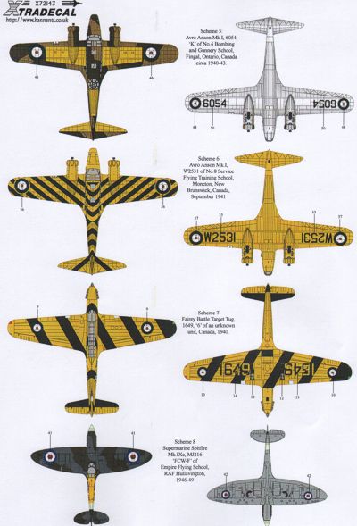 Xtradecal - 1/72 Re-printed, back in stock. Commonwealth Trainers (8) Airspeed Oxford (3) 3583 ex BG365 24 Air School, Standard Beam Approach Flight, Nigel, Gauteng, South Africa 1945; PG943/T Fighter Command Instrument Training Flight, Raf Tangmere 1948; A5680/64 35th Elementary Flying Training School, Neepawa, Manitoba, Canada 1942; North-American Harvard IIa 7470 ex EX821 62 Air School (Central Flying School) Bloemspruit, South Africa 1945; Avro Anson Mk.I 6065/K nO 6 Bombing and Gunnery School, Fingal, Ontario, Canada 1940-43; W2531 No 6 Service Flying Training School, Moncton, New Brunswick, Canada, 1941; Fairey Battle Target Tug 1649/6 unknown unit, Canada 1940; Supermarine Spitfire Mk.IXe MJ216 FC-WF Empire Flying School, Raf Hullavington 1946-48