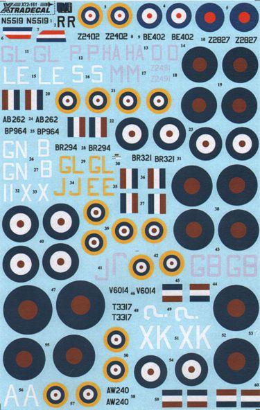 Xtradecal - 1/72 The Battle for Malta RAF - Gloster Gladiator N5519/R 1940; Hawker Hurricane IIa Z2403 GL-P 185 Sqn 1941; BE402 LE-S 242 Sqn; Z2827/M Malta Night Fighter Unit; Z2491 HA-D 126 Sqn Sgt Greenhalgh; Supermarine Spitfire Mk.Vb AB262 GN-B 249 Sqn F/O Robert McNair 1942; BP964 X-I 601 Sqn Sgt Dickson; BR294 GL-E 185 Sqn; BR321 GL-J 185 Sqn Flt.Lt John Plagis; Bristol Blenheim IV V6014 GB-J 105 Sqn; Beaufighte IC T3317 XK-? 272 Sqn S/Ldr A.W.Fletcher; Beaufort Mk.I AW340/A 39 Sqn