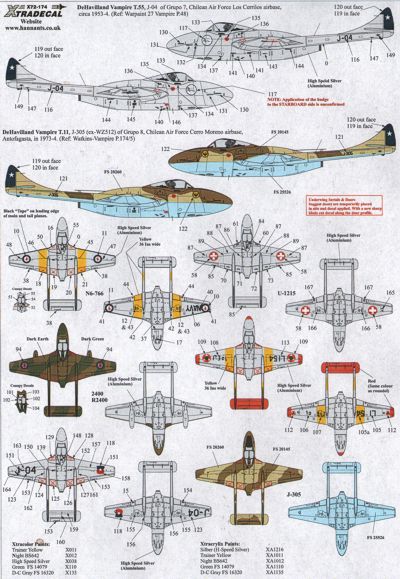 Xtradecal - 1/72 de Havilland Vampire T.55 Overseas Operators Part 2 (7) R Australian Navy XG766 VT724 Nowra, NSW 1950s; Swiss AF U-1215 MFS 88 Emmem 1990; Rhodesian AF 2400 2 Sqn in 1968 and 1972 with different national insignia; Lebanon AF L154 1970; Chilean AF J-04 Grupo 7 Los Cerrilos 1953 High speed silver; J-305 (ex WZ512) Grupo 8 Cerro Moreno 1973 Brown/Sand/Blue. For NEW Airfix kit.