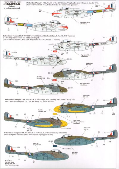 Xtradecal - 1/72 DH 100 Vampire F.3/FB.5 (13) F.3 VT809/Z 73 Sqn Malta 1949; VF321 604 County of Middlesex) Sqn R.Aux.AF North Weald 1951; VT799 614 (County of Glamorgan) Sqn. R.Aux.AF Llandow 1951; FB.5 WA163/G No 71(Eagle) Sqn, CO Sqn.Ldr.Hardy, RAF Gutersloh 1951; WA402/J 612 (County of Aberdeen) Sqn R.Aux.AF Dyce 1956 Dk.Green/Dk Sea Grey/Silver with red trim; WA320 RAF Honiley Wing Leader 1953; WA432/D 603 (City of Edinburgh) Sqn, R.Aux.AF Turnhouse 1954 High Sped Silver or Camouflaged 1955; VX474 A-K 118 Sqn RAF Fassberg 'Op Coronet' 1953 DG/DSG/PRU Blue with yellow nose and trim; WA189 K-B 4 Sqn Fg.Off E.Lack RAF Jever 1952 DG.DSG/PRU Blue; WA331 A-T 112 Sqn with shark mouth, green fin with dog on white disc; RAF Fassberg 1951; WG833/GM Wg.Cdr E.G.I Millington Caledonian Wing Leader 603 (City of Glasgow) Sqn and 612 (County of Aberdeen) Sqn R.Aux.AF Turnhoue 1954 or coded DS flown by Wg.Cdr W.G.G Duncan-Smith 1953; VZ305/RLS Wg.Cdr R.L.Smith Wing Leader 607 (Countyof Durham) Sqn and 608 (North Riding) Sqn R.Aux.AF 1954 DG/DSG/PRU Blue. All overall High Speed Silver unless camouflaged as mentioned [de Havilland Vampire FB.5]
