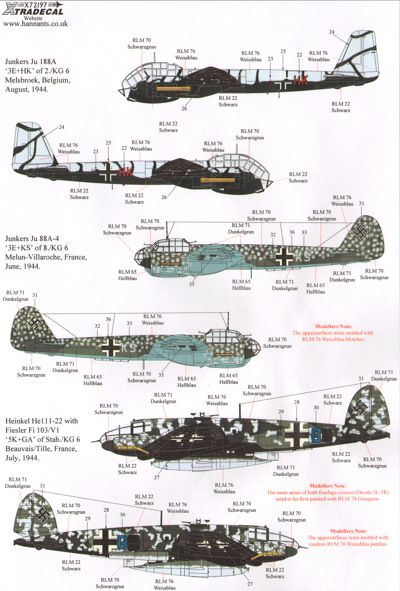 Xtradecal - 1/72 Scale D-Day 70th Anniversary June 1944-2014 Luftflotte 3 (8) Focke-Wulf Fw 190A-6 WkNr 530120 Black <-+- Oberleutnant Pips Priller Co JG26 Lille; Fw 190A-8 WkNr 3317 Black <<-+- Major Kurt Buhligen Co Jg 2 Creil; Messerschmitt Bf 109G-6 WkNr 166224 White 10 2.JG.3; Bf 109G-6 U-2 WkNr 412951 White 16 yellow under nose and red tail band Lt Horst Prenzel Staffelcapitan 1.JG.301;Bf109G-6 Black Chevron and Bars possibly flown by II Gruppen Adjutant Oberleutnant Max Bruno Fischer of Stab II./JG3; Junkers Ju 188A JE+HK 2/KG.6 Melsbroek, Belgium; Junkers Ju 88A-4 3E+S 8./KG.6 Melum-Villaroche; Heinkel He 111-22 with Fiesler Fi 103/V1 5K+GA Stab/KG.6 Beauvais.