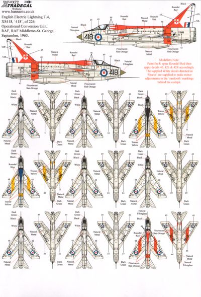 Xtradecal - 1/72 EE/BAC Lightning T.4/T.5 Part 1 (9) Mk.T.4 XM974/T 74 Sqn Black fin and spine RAF Leuchars 1965; XM995/T 92 Sqn Blue fin and spine RAF Wildrenrath 1977; XS418/418 226 OCU Red spine and trim RAF Middleton St George 1963; Mk.T.5 XS421/T 111 Sqd RAF Wattisham 1974; XS454/454 226 OCU 2T Sqn RAF Coltishall 1974; XS452 Akrotiri Station Flt 1975 with pink fin; XS421/S 23 Sqn RAF Leuchars 1974; XV328/T 5 Sqn RAF Binbrook 1977; XS459/X 56 Sqn RAF Binbrook 1976. All overall natural metal. [BAC/EE T.Mk.4 Lightning BAC/EE T.Mk.5 Lightning]