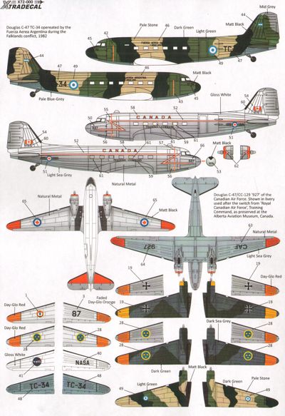Xtradecal - 1/72 Douglas C-47 International Liveries (7) French Marine 41-18487/87 Escadrille 56.S 1968, Luftwaffe 26989 14-01 1967 now at Deutches Museum, Sweden 79008 13 Wing/78 Malmen 1978 camoflaged, 13 Wing/73 overall natural metal, NASA N817NA overall white, Argentina TC-34 Falklands 1982 camoflaged, Canadian AF No.927 preserved at the Alberta Aviation Museum.