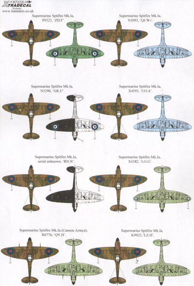 Xtradecal - 1/72 Supermarine Spitfire Mk.Ia Battle of Britain 1940 Pt.1 (10) R6776 QV-H 19 Sqn Flt/Sgt George Unwin RAF Fowlmere, R6800 LZ-N 66 Sqn S/Ldr Rupert Leigh RAF Gravesend, P9398 KL-B 54 Sqn P/Off Alan Deere RAF Hornchurch, RN-N F/Off Desmond Sheen 72 Sqn RAF Leconfield, K9953 ZP-A 74 Sqn Flt/Lt Sailor Malan RAF Hornchurch, N3290 GR-U 92 Sqn RAF Hornchurch, P9323 ZD-F 222 Sqn Hornchurch, X4382 LO-G 602 Sqn Plt/Off Osgood Hanbury RAF Westhampnett, N3093 QJ-W 616 Sqn Flt/Lt Denys Gilliam RAF Leconfield, X4593 UO-A 266 Sqn RAF Wittering 7/1940,