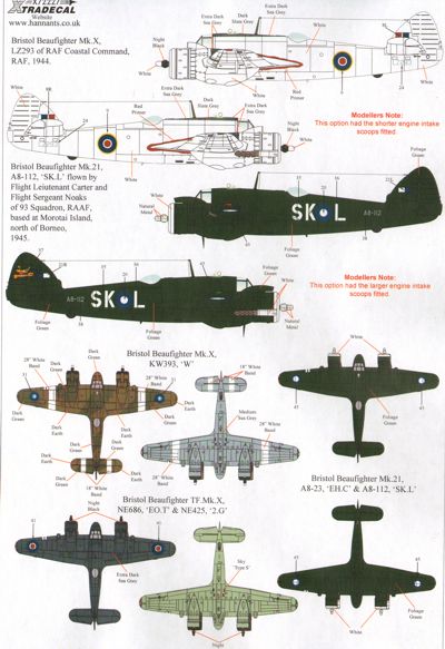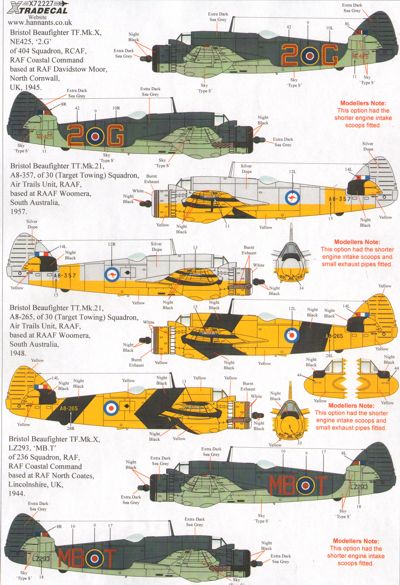 Xtradecal - 1/72 Bristol Beaufighter Mk.X X72227 Bristol Beaufighter Mk.X, TF Mk.X, Mk.21, TT Mk.21 (10) Mk.X KW393/W 27 Sqn Burma 1945, LZ293 RAF Coastal Command 1944, TF Mk.X NE686 EO-T 404 Sqn RCAF Flt/Off Flynn/ P/O Michael RAF Coastal Com RAF Dallachy 1945, LZ451 EE-M 404 Sqn RCAF Wg/Co Alfred Kitchener Gatward DSO D-Day stripes RAF Strubby 1945, NE425 2-G 404 Sqn RCAF RAF Davidstow Moor, Cornwall 1945, LZ293 MB-T 236 Sqn RAF Coastal Command RAF North Coates, Lincs 1944, Mk.21 A8-23 EH-C 31 Sqn RAAF Flt/Off /P/O Lyons Morotai 1945, A8-112 SK-L 93 Sqn RAAF Morotai Island, Borneo 1945 TT Mk.21 A8-265 30 (TT) Sqn Air Trials Unit RAAF Woomera 1957, A8-265 30(TT) Sqn RAAF Woomera 1948,