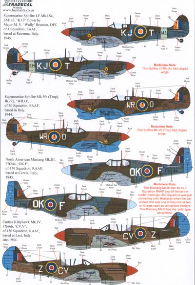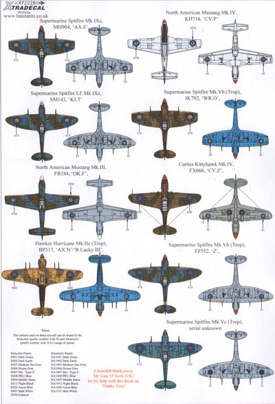 Xtradecal - 1/72 Fighters Over Africa and the Mediterranean Pt.1 Hawker Hurricane Mk.I Tropical version W9293/U 75 Sqn RAF 1942, Hurricane Mk.IIc (Trop) HL885 AX-Z 'Oops' 1 Sqn SAAF 1942, BP317 AX-N 'B Lucky III' 1 Sqn SAAF 1942, Supermarine Spitfire Mk.Vb (Trop) EF552/Z 7 Sqn SAAF Cyprus 1943, JK792 WR-O 49 Sqn SAAF Italy 1844, Spitfire Mk.Vc(trop) KJ-Z 4 Sqn SAAF Sicily 1943, Spitfire Mk.IXc H904 AX-E 1 Sqn SAAF Italy 1944, SM143 KL-T Major M.V.Wally Brunton DFC 4 Sqn SAAF Italy 1945, North-American P-51B Mustang Mk.III FH244 OK-F 450 Sqn RAAF Italy 1945, P-51D Mustang Mk.IV KH716 CV-P 3 Sqn RAAF Italy 1945, Curtiss P-40N Kittyhawk Mk.IV FX666 CV-V 450 Sqn RAAF Italy 1944.