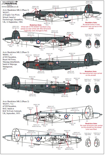 Xtradecal - 1/72 Avro Shackleton MR.2 Pt 2 (5) WG557 Empire Test Pilots School Farnborough 1964 DSG/White, WG557 T-L 228 Sqn RAF St Eval 1955 MSG/White, WR961/U 204 Sqn RAF Majunga 1971 White/DSG, WL758 37/E 37 Sqn Operation Musketeer, Suez 1956 Overall DSG with Black/Yellow stripes round rear fuselage and wings, WL758 38/V 38 Sqn RAF Hal Far 1966 White/DSG, WL738/204 204 Sqn RAF Ballykelly NI 1957 Overall DSG with Black/White fuselage bands.