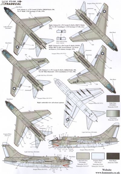 Xtradecal - 1/72 Colourful USN Corsairs. Vought A-7B/E Corsair II Part 1 (4) A-7B 154370 AF/500 VA-205 Green Falcons NAS Atlanta 1976 A-7E 158830 AC/300 VA-37 Bulls USS Saratoga 1978 A-7E 158673 AC/402 VA-105 Gunslingers USS Saratoga 1972 A-7E 160866 NG/300 VA-145 Blue Diamonds USS Constellation 1981