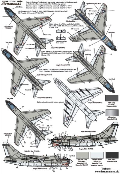 Xtradecal - 1/72 Colourful USN Corsairs. Vought A-7B/E Corsair II Part 2 (4) A-7B 154479 NM/401 VA-215 Barn Owls USS Franklin D.Roosevelt Bi-Centennial 1976, A-7E 156831 NG/331 VA-146 Blue Diamonds USS Constellation 1978, A-7E 157563 AG/500 VA-12 Clinchers USS Independence 1972, A-7E 158842 AD/401 VA-174 Hellrazors NAS Cecil Field, FL 1976