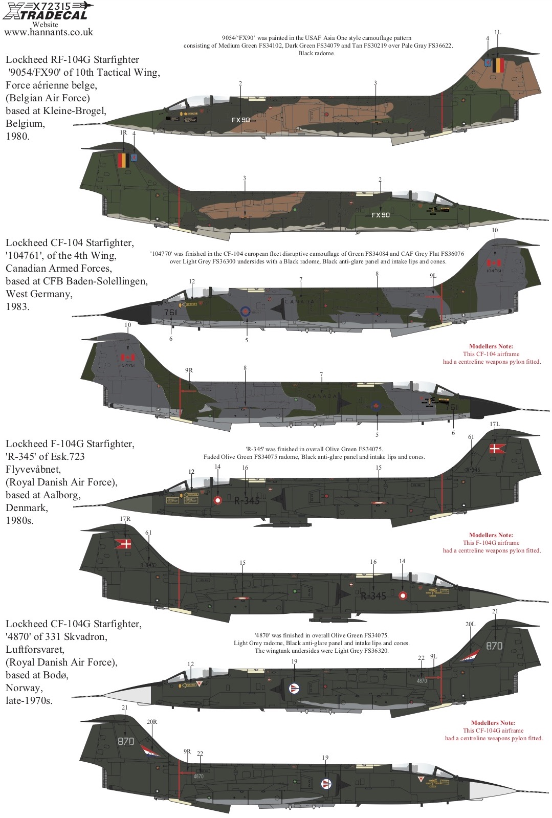 Xtradecal - 1/72 Lockheed F-104 Starfighter Collection Pt2 (13)RF-104G Starfighter '9054/FX90' of 10th Tactical Wing, Force aérienne belge, (Belgian Air Force) based at Kleine-Brogel, Belgium, 1980.