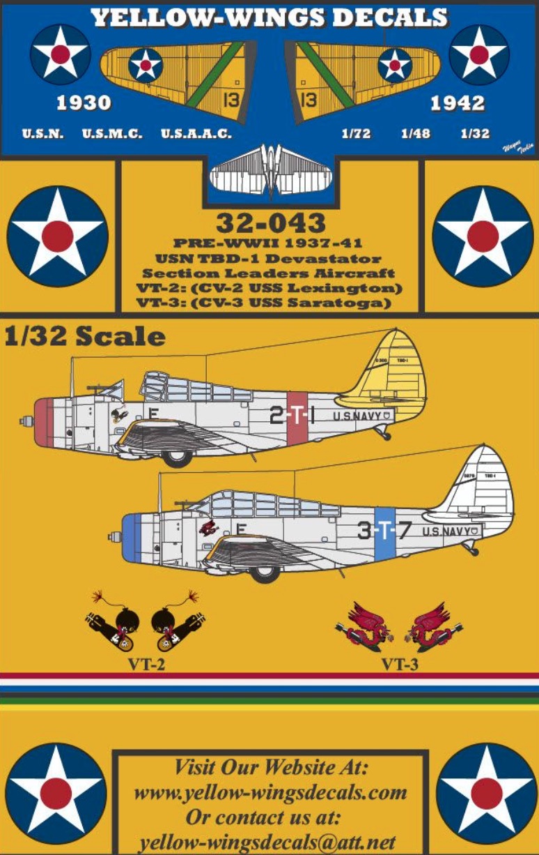 Yellow Wings - 1/32 U.S. Navy Pre-WWII Douglas TBD-1 Devastator, VT-2 Uss Lexington, VT-3 Uss Saratoga