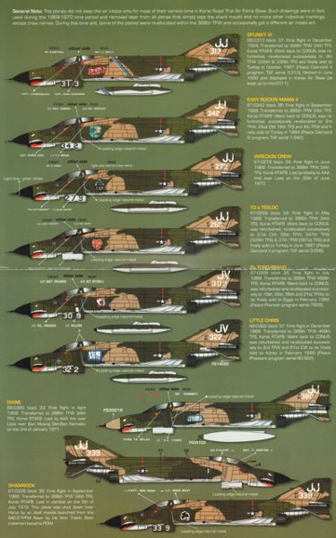 Zotz - 1/48 F-4E Phantom 388th TFW at Korat RTAB 1968 coded JJ and JV all with shark mouths Pt 2 (10) 68-313 Spunky VI, 70-342 Easy Rockin Mama II, 70-279 Wreckin Crew, 70-268 TD's Teeloc, 70-309 El Toro Bravo, 80-332 Little Chris, 60-380 Diane, 67-339 Shamrock, 70-268 Paper Tiger, 70-306 War Lover. Includes a brief history of each Phantom.
