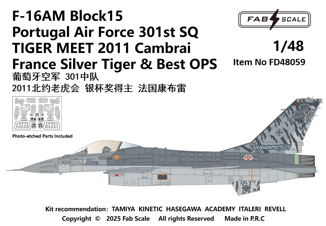 FabScale Studio - 1/48 General-Dynamics F-16AM Block 15 Portugal Air Force 301st Sq Tiger Meet 2011 Cambrai France Silver Tiger & Best Ops Photo-etched Parts Included