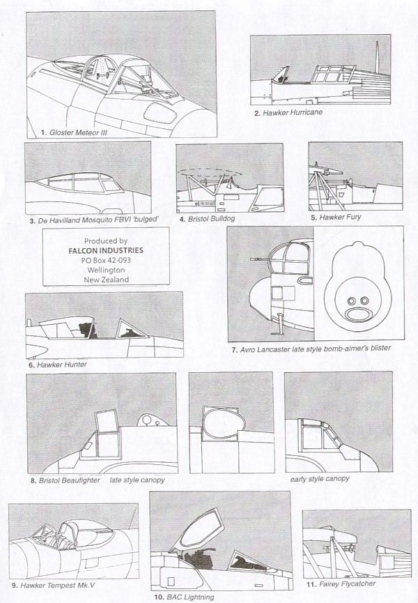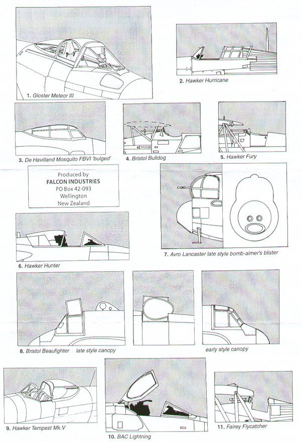 Falcon - 1/48 RAF part 2. Gloster Meteor F.3 (for Tamiya kits) Hawker Hurricane Mk.I [unarmoured windscreen, early external armour glass windscreen, standard windscreen] (in open position) (for Hasegawa kits) de Havilland Mosquito Mk.VI (bulged type) (for Tamiya kits) Bulldog LI/SR Hawker Fury (for Inpact and Lindberg kits) Hawker Hunter (in open position) (for Academy kits) Avro Lancaster B.I/III with late style bomb aimers window (for Tamiya kits) Bristol Beaufighter early/late types (in open position) (for Tamiya kits) Hawker Tempest Mk.V (in open position) (for Eduard kits) BAC/EE Lightning F.2A / F.6 (in open position) (for Airfix kits) Fairey Flycatcher (for Inpact kits)