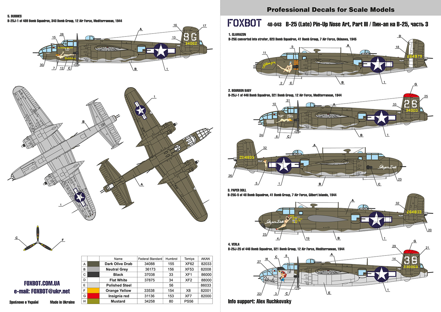 Foxbot Decals - 1/48 North-American B-25G/H/J Mitchell (Late) 'Pin-Up Nose Art and Stencils' Part Part 3 Academy, Accurate Miniatures, Hasegawa, Monogram, Pro Modeler, Revell kitsNew