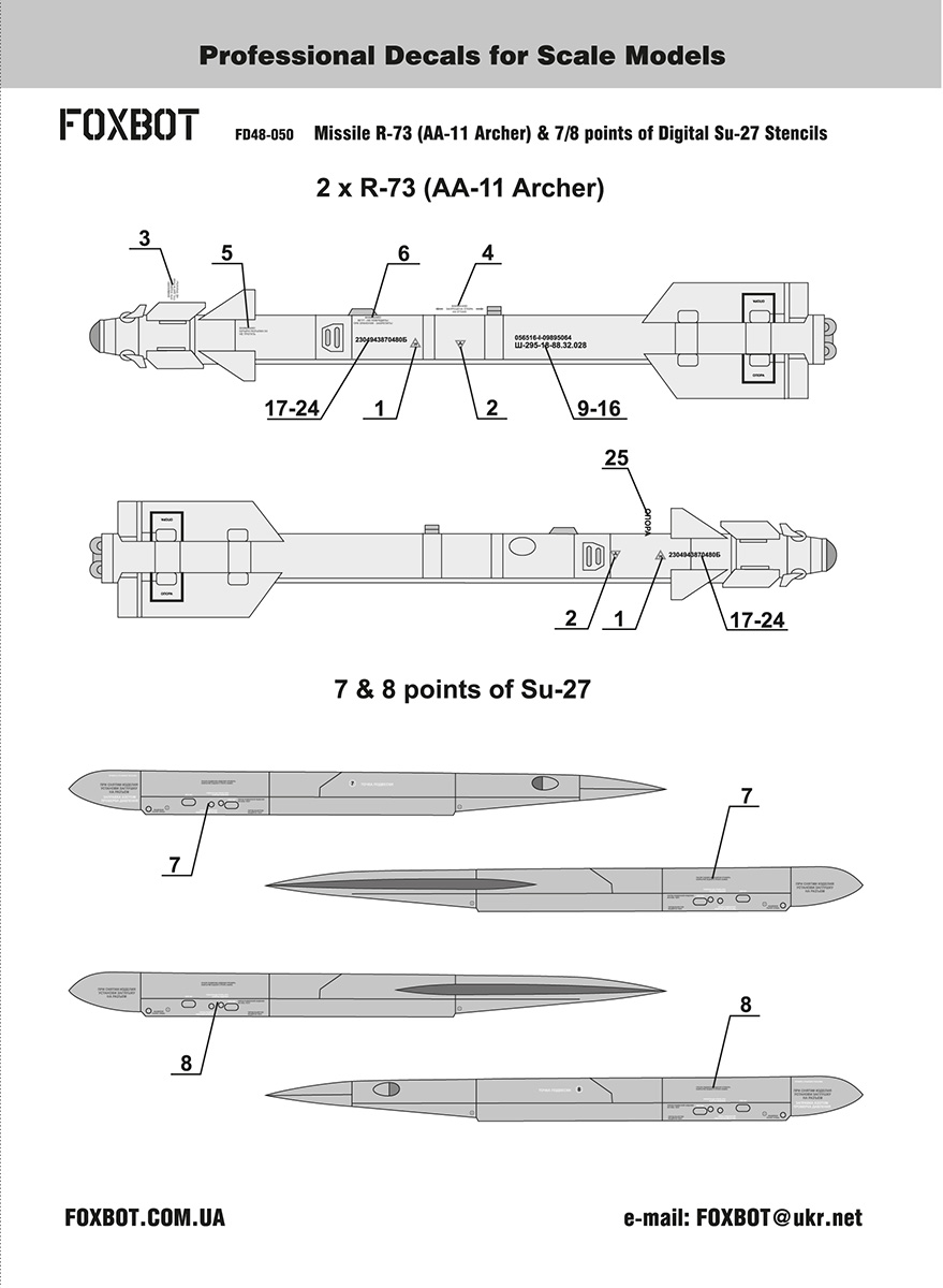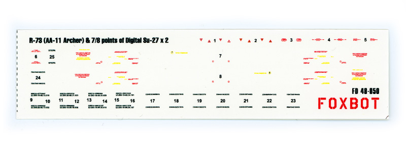 Foxbot Decals - 1/48 Stencils for Missile R-73 (AA-11 Archer) & 7/8 points of Digital Sukhoi Su-27
