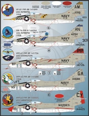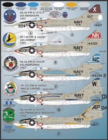 Furball Aero-Design - 1/48 Colorful Gray & White Cougars. "Colorful Gray & White Cougars" includes options for seven F9F-8 single seat Cougars and three Grumman F9F-8P Photo Reconnaissance Cougars in the handsome Gull Gray over White scheme. This set is designed for use with the 1/48 Kittyhawk kit, and enough stenciling & data is provided for the modeler to build two complete models. Here's a rundown of the aircraft covered: VA-46, F9F-8 141217, USS RANDOLPH , 1957 VF-144, F9F-8 144301, USS HORNET, 1957 VA-26, F9F-8 144339, USS KEARSARGE, 1957 VF-123, F9F-8 144353, NAS EL CENTRO, 1956 VA-36, F9F-8 141177, USS FRANKLIN D. ROOSEVELT, 1958 VF-81, F9F-8B 141099, USS INTREPID, 1958 VA-76, F9F-8 144294, USS INTREPID, 1958 VFP-61, F9F-8P 141726, USS LEXINGTON, 1957 VFP-62, F9F-8P 141688, 1958 VMCJ-2, F9F-8P 144425, USS SARATOGA, 1957