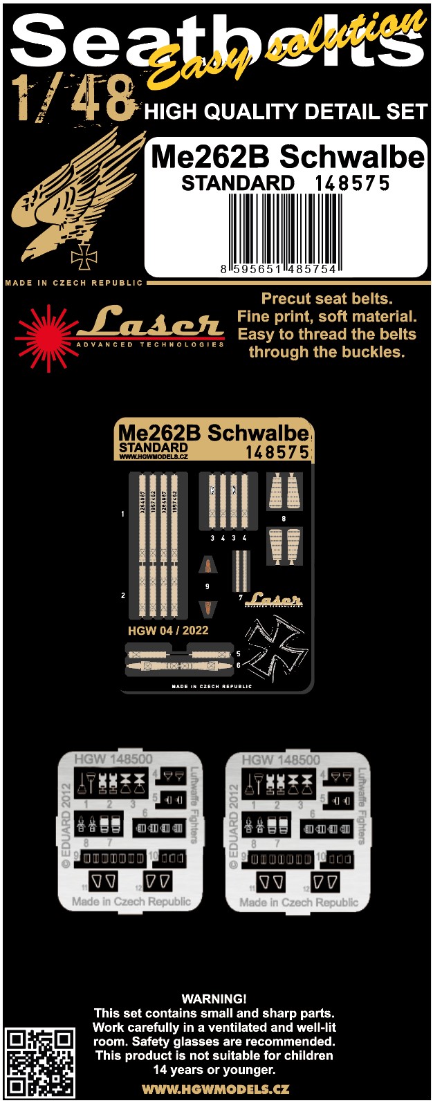 HGW - 1/48 Messerschmitt Me-262B Schwalbe (Standard) pre-cut (laser) Seatbelts