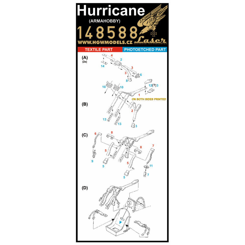 HGW - Hawker Hurricane Mk.IIC Seatbelts 1/48 Textile seat belts designed for aircraft Hawker Hurricane for Arma Hobby kits. Belts are made from real microfibre and in combination with included photo etched buckles they look highly realistic.