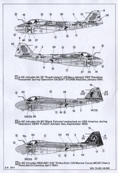 Hi Decal - 1/48 Grumman A-6E 'TRAM' Intruder (3) 161667 AJ/633 VA-36, USN, Uss Theodore Roosevelt Operation 'Desert Storm', 1991, tan and sand scheme, 157010 AB/500 VA-85, USN, Uss America Operation 'Deny Flight', 1993, 161681 EA/500 VNA(AW)-332, USMC, Mcas Cherry Point, 1993