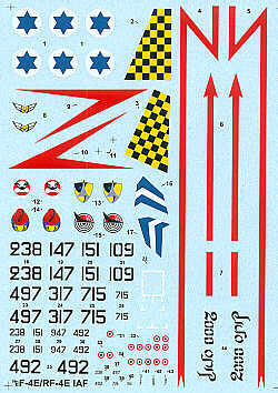 HI Decal - 1/72 McDonnell F-4E/RF-4E/F-4E(S), Kurnass 2000 Phantom Israeli (8) F-4E from Scorpion, Bat Orange Tail and 'Ahat' Squadrons, F-4E(S) 'Atalev' Sqn, McDonnell RF-4E black/yellow check rudder, etc.